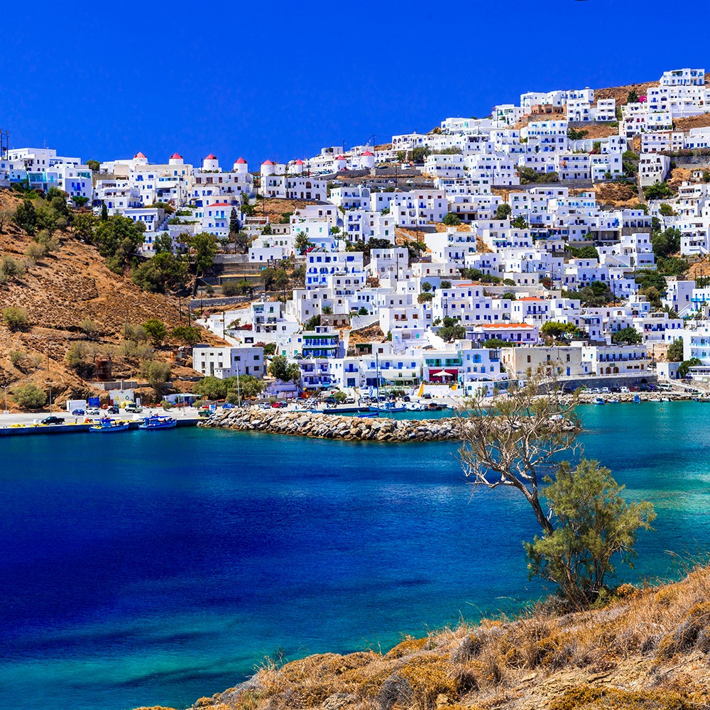 The island’s harbor, Pera Yialos, was the first city in the region founded by Italians. Its main attractions are the Archaeological Museum, which offers a wealth of sightseeing, and a row of eight picturesque windmills.