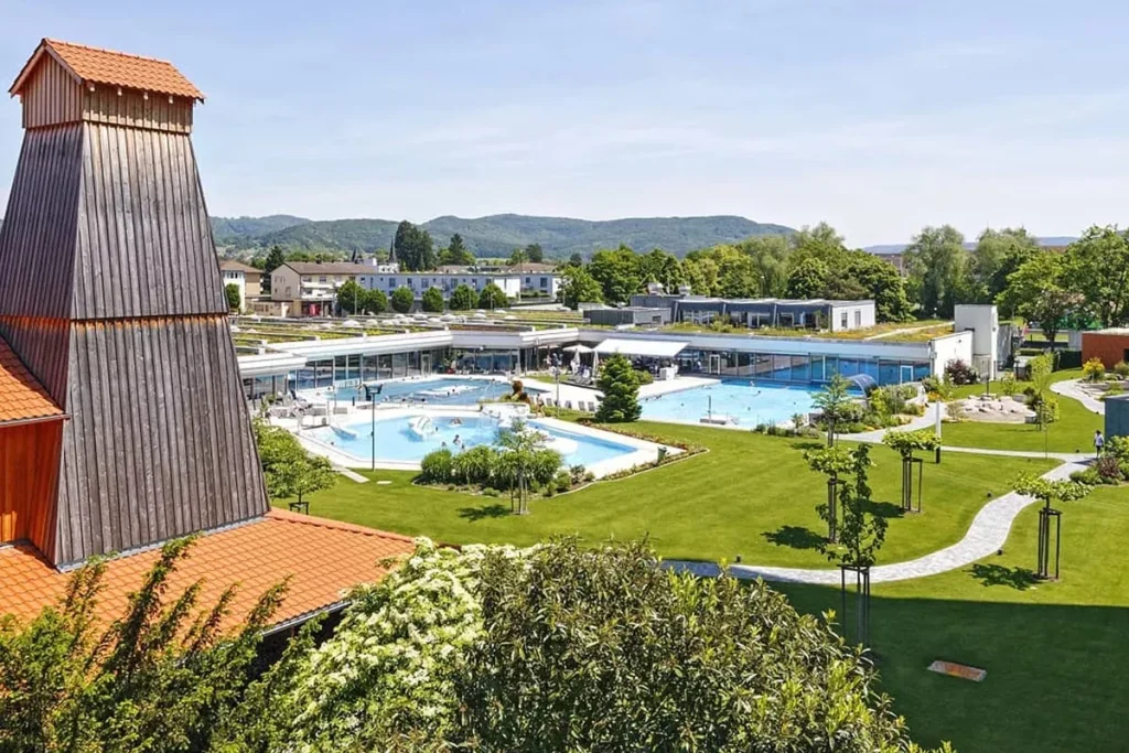 Bad Zurzach is home to Europe’s largest thermal spa, covering an area of ​​1,260 square meters. In addition to four thermal pools with water temperatures ranging from 32 to 36 degrees Celsius, the complex also includes: whirlpool baths, an artificial river, a fitness center, a café, a solarium, several steam rooms, saunas, and a jacuzzi.