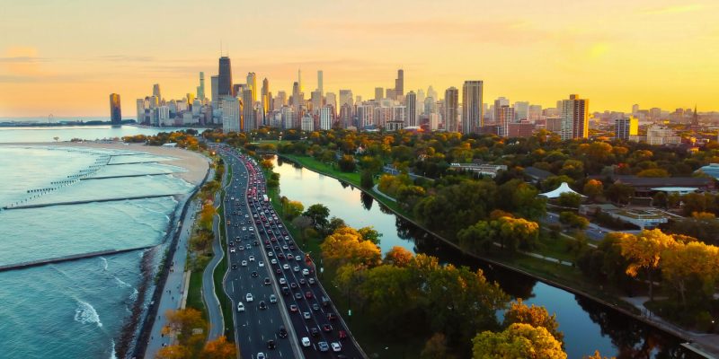 Chicago Cityscape at Sunset with Lakefront View. Aerial view of Chicago skyline at sunset, showing Lake Michigan shoreline, tree-lined parks, and a busy roadway along the waterfront Chicago is a major metropolis—a perennial rival to New York City and the...