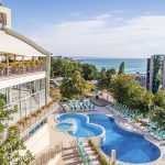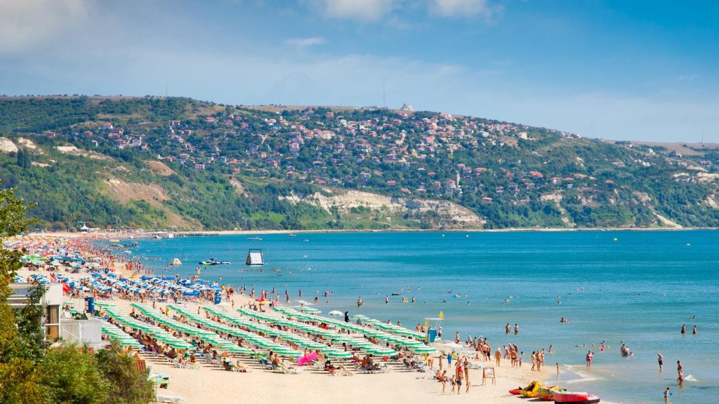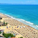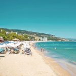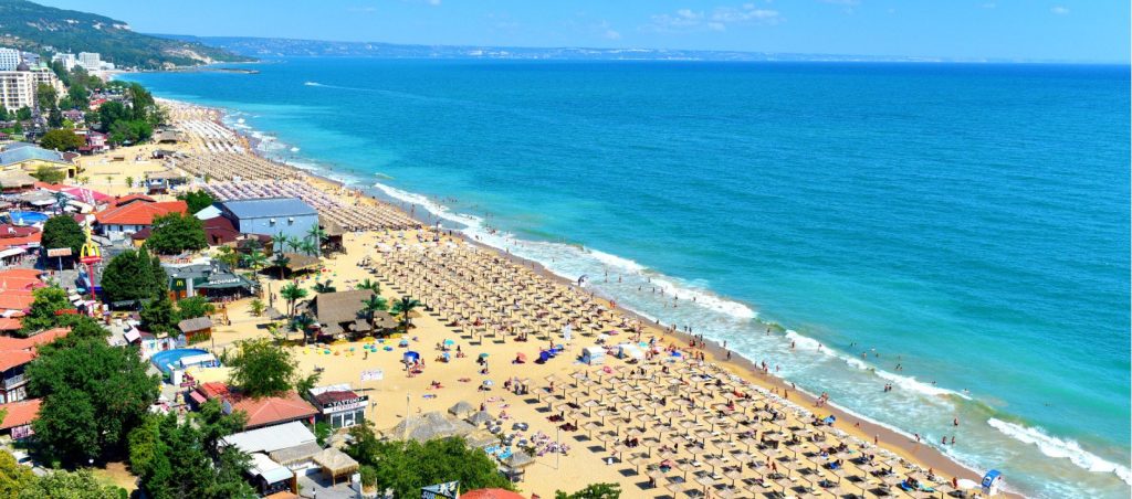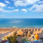 The beach stretches the entire length of the resort, reaching 100 meters in width in places. The sea is shallow near the shore, with fine-grained sand on the shore. The seabed is clean, but the entry into the water is not as shallow as, for example, in Sunny Beach. The infrastructure is well-developed, including cafes, children’s playgrounds, water sports, and sports grounds. The sand on the beach is regularly cleaned.