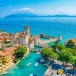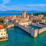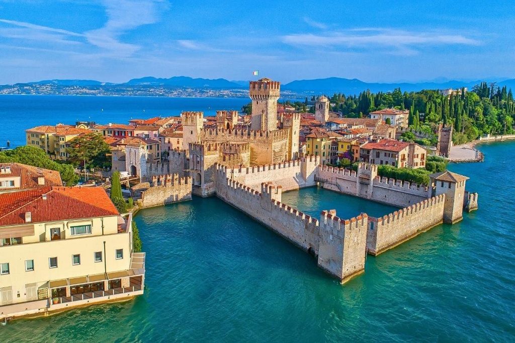 The next resort is Sirmione, which occupies a peninsula, and its Castello Scaligero fortress, once a military stronghold for the Veronese fleet, rivals in beauty the Grotto of Catullus, a unique ancient Roman mansion. Also noteworthy in Sirmione are the churches of San Pietro in Mavino, decorated with frescoes from the 12th to 16th centuries, and Santa Maria Maggiore, home to a complex of 15th-century frescoes. The area also boasts a cozy spa center with local sulfur water and a water park.