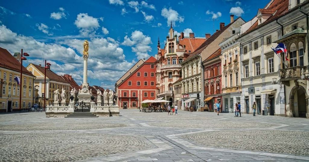 The center of Maribor’s historic center is the Main Square, where a memorial column was erected in 1743 to commemorate the end of the plague. A gilded statue of the Virgin Mary crowns the column, and six sculptures and a white marble altar surround it, creating a striking Baroque ensemble. The square is also surrounded by important buildings, such as the 18th-century Baroque Church of St. Eloysius and the Town Hall, with its majestic stone balcony adorned with the city’s coat of arms, a dove flying over the fortress gates.