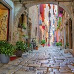 Carera Pedestrian Street in Rovinj’s old town attracts tourists with its shops and stalls. During the summer months, the marketplace continues until late at night.