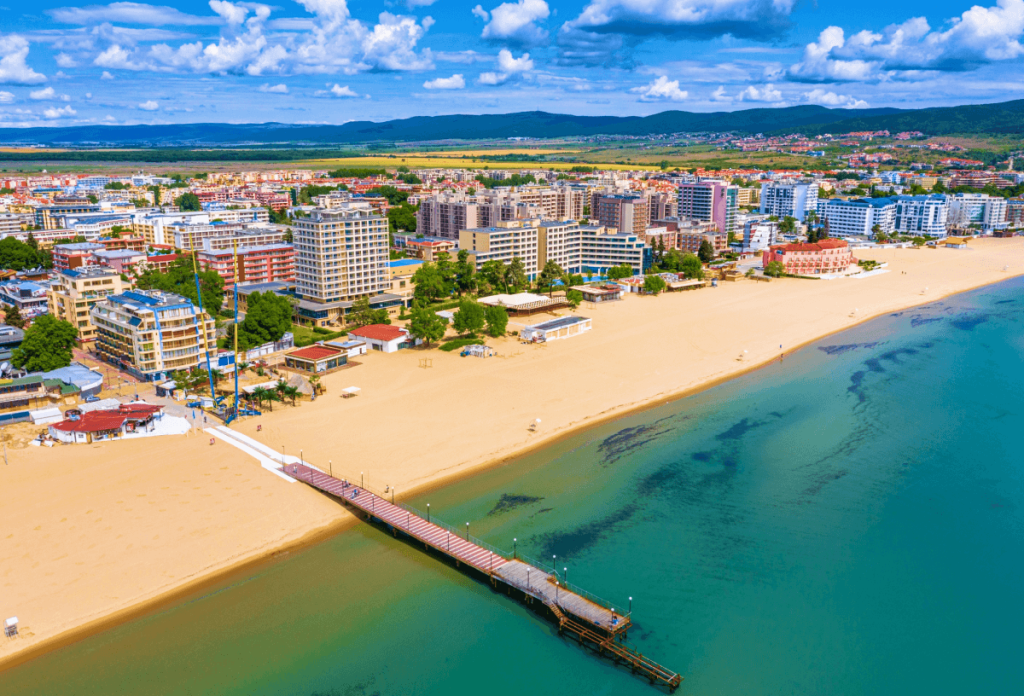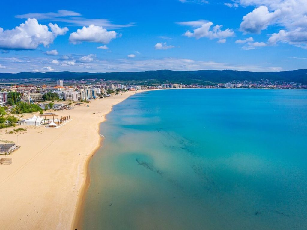 Sunny Beach, located on the Black Sea coast in Bulgaria, boasts a 7-kilometer-long beach. The beach’s width varies from 60 meters in the north and south to 100 meters in the center. This part of the coast has received the Blue Flag for its cleanliness and environmental safety. The beach is ideal for families with small children, thanks to its sandy surface, gradual entry into the water, and shallow waters along the shore.