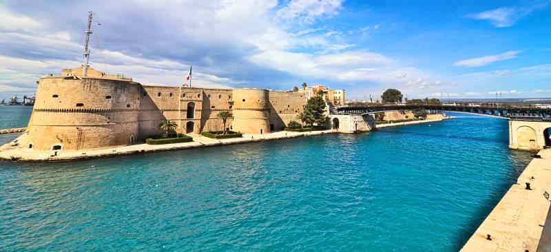 A tour of Taranto’s attractions usually begins with the Old Town, which is located on a small island at the mouth of Mar Piccolo. Approaching from the east, the imposing Fortress of Sant’Angelo, also known as the Aragonese Castle, immediately catches your eye. Built in the late 15th century on the site of older Byzantine fortifications to control the shipping channel, this fortress served as a prison under the Habsburgs and is today administered by the Italian Navy. Entry to the fortress is permitted only as part of guided tour groups, which gather at the entrance.