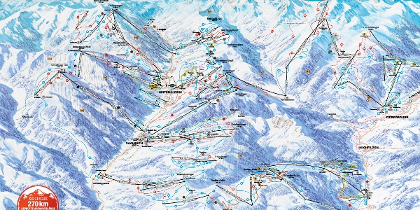 The longest piste in the resort is Schattberg-Ost-Jausen, 7 km long, with an elevation gain of 1020 m.