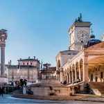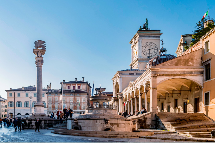 The main square of Udine is Piazza della Libertà. The square’s architectural ensemble is composed of Renaissance buildings blending in a unified style. Many consider the Libertà to be one of the most beautiful monuments of Venetian style outside of Venice itself. Among the buildings in the square is the Loggia Lionello, an elegant Gothic palazzo of white and pink marble. Opposite stands the 16th-century Chapel of San Giovanni with its Lippomando portico and clock tower. To the left of the chapel stands the Arch of Bollani with the Venetian Lion of St. Mark, leading to the castle hill, as well as the Peace Monument, erected by Napoleon in 1819.
