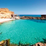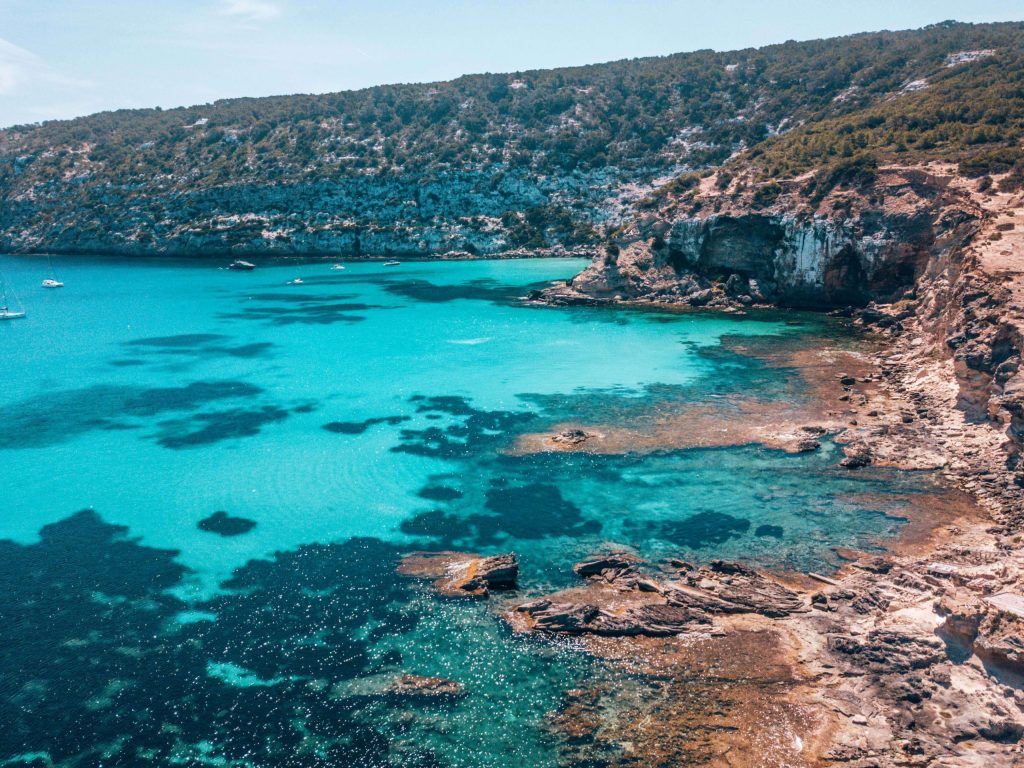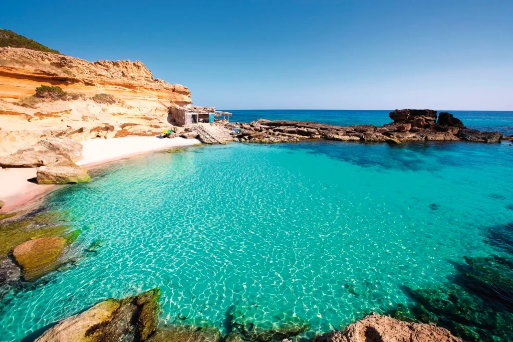 Cala Saona is a secluded bay overlooking Ibiza and the “mystical mountain” of Es Verda.